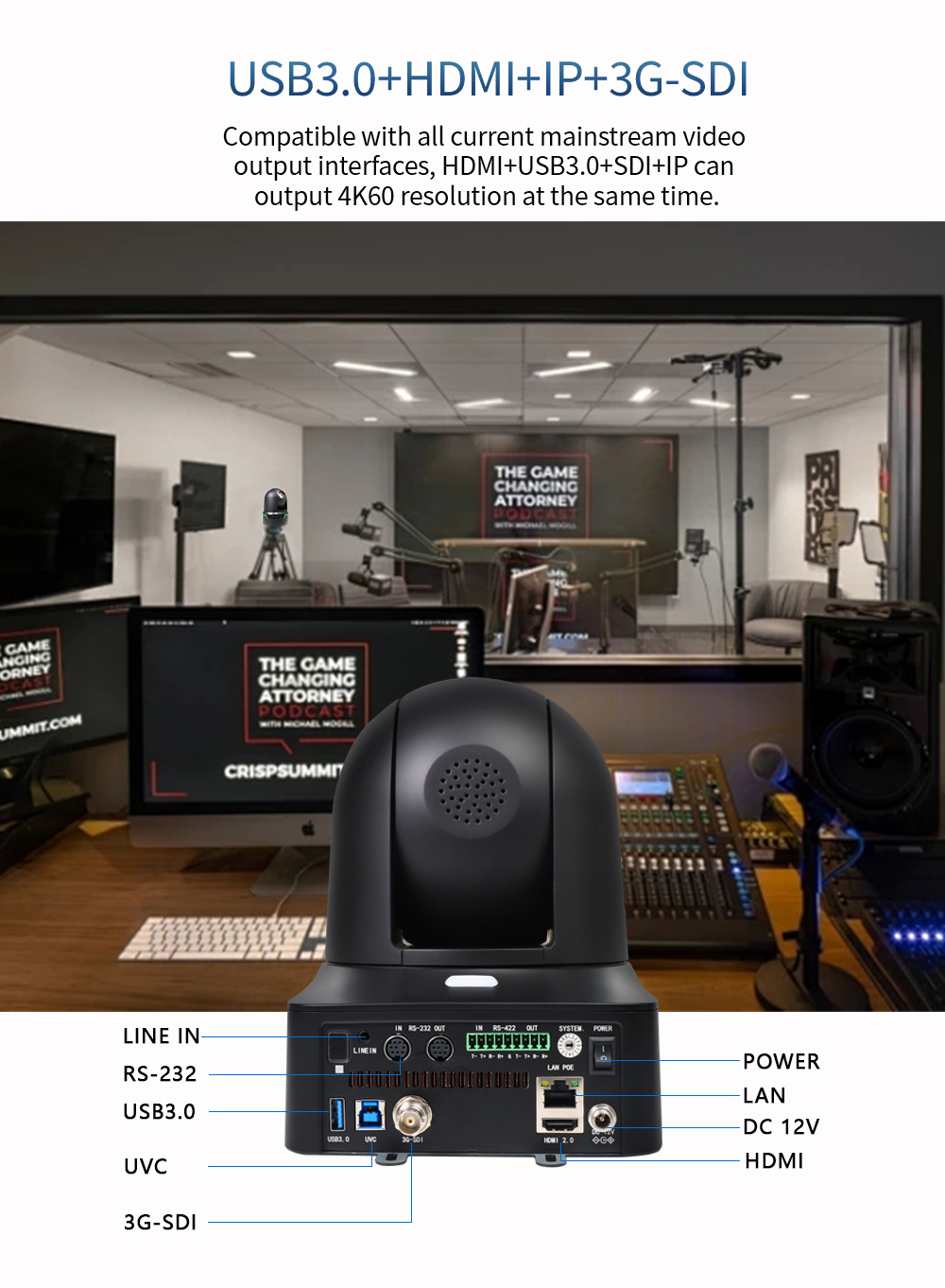 - USB3.0+HDMI+IP+SDI Full interfaces, Rich Application Scenarios: Compatible with all current mainstream video output interfaces, HDMI+USB3.0+IP can output 4K60 resolution at the same time.